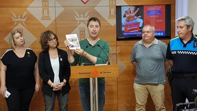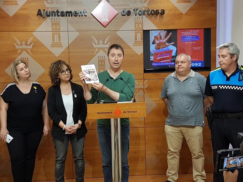 Avui l’Ajuntament ha presentat el protocol contra les agressions sexistes que començarà a aplicar-se a la capital del Baix Ebre aquesta setmana, a partir de la Festa del Renaixement. Han participat a la roda de premsa la regidora de Serveis Socials, Maria Jesús Viña; el regidor de Festes i Serveis, Domingo Tomàs; la regidora de Joventut, Cristina Girón; el regidor de Seguretat, Alfredo Ferré, i el cap de la Policia Local, Jesús Fernàndez.