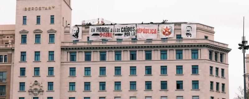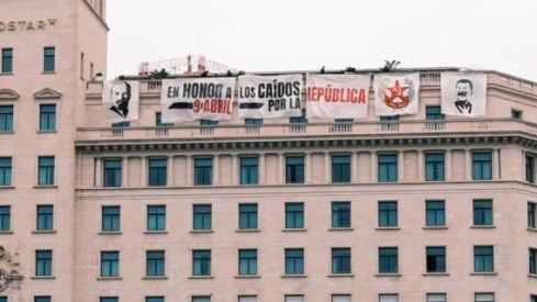 La imatge volia emular-ne una de fa 86 anys. Quan, durant la guerra civil, el PSUC ocupava l'Hotel Gran Colón i van mostrar pancartes amb els rostres dels dos líders comunistes.