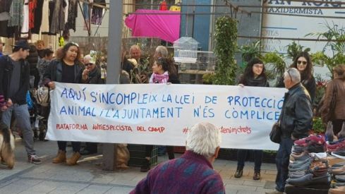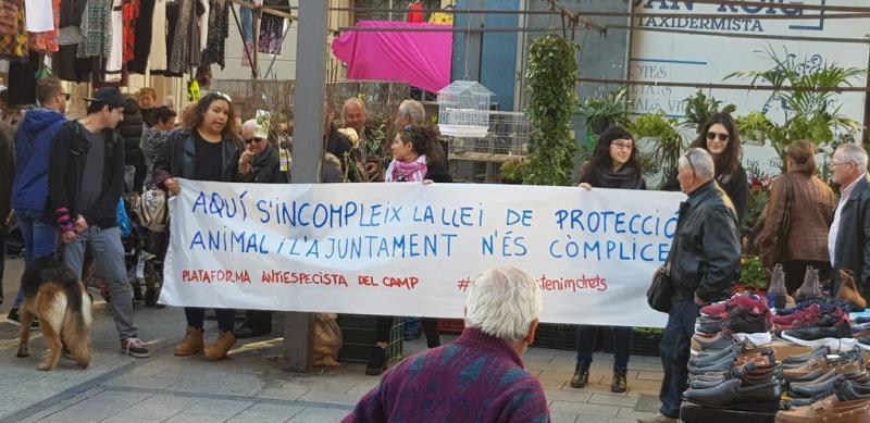 La Plataforma antiespecista del Camp ha organitzat aquest dissabte al matí una concentració en contra de la venda d'animals. La concentració ha tingut lloc al mercat de marxants de Reus d'11.00 h a 12.00 h del matí. Sota el cartell "Aquí s'incompleix la llei de protecció animal i l'ajuntament n'és còmplice" la jove plataforma ha mostrat el seu rebuig cap a la venda d'animals vius al mercat i ha criticat l'ajuntament de la ciutat per no aplicar l'ordenança de benestar animal de Reus. Aquesta ordenança tot i que ja ha estat aprovada no entrarà en vigor fins al mes d'abril.