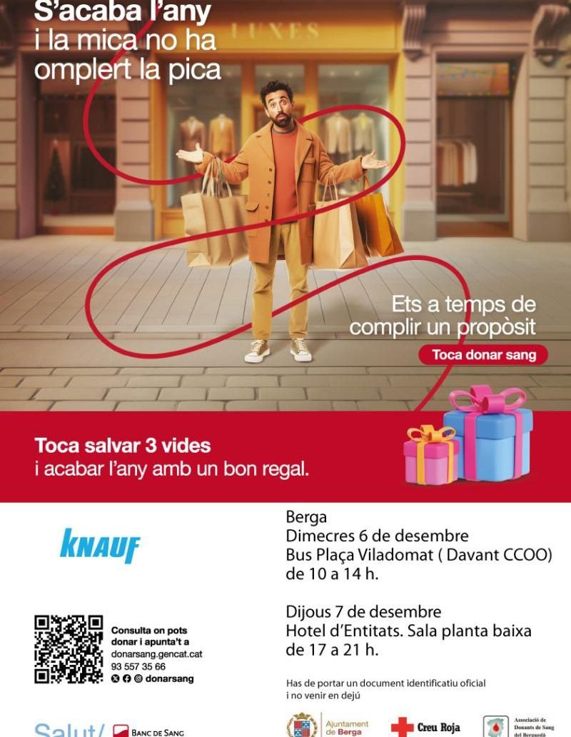 La campanya de donació de sang del mes de desembre compta amb la implicació de l’Ajuntament de Berga, Creu Roja Berguedà, l’Associació de Donants de Sang del Berguedà i la col·laboració especial de l’empresa Knauf.