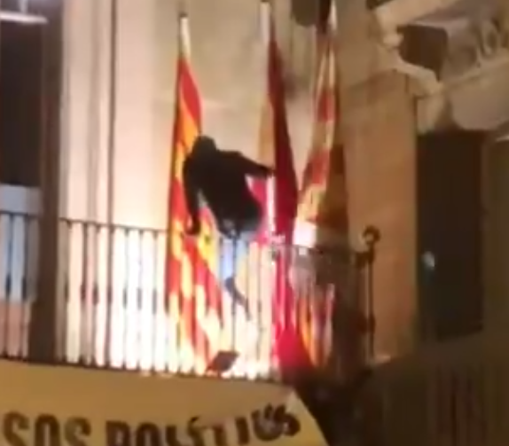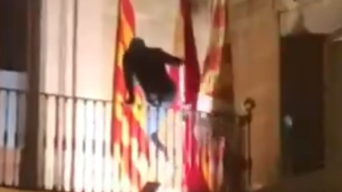 Tal com es veu en un vídeo difós a les xarxes socials, dues persones s'han enfilat al balcó, han despenjat la bandera del pal i l'han llançat al terra de la plaça Major per cremar-la.