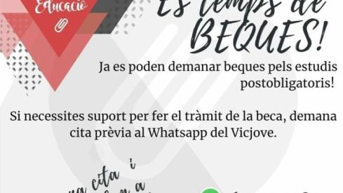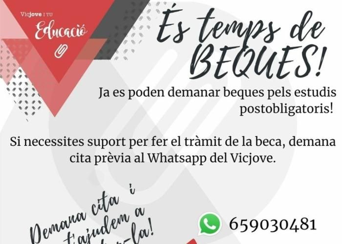El Vicjove activa un nou servei per acompanyar i ajudar el jovent a tramitar les beques pels estudis postobligatoris, tant universitaris com no universitaris (batxillerat, cicles formatius de grau superior i de grau mitjà). Per accedir-hi cal concertar cita prèvia a través del número de whatsapp del Vicjove 659 03 04 81.