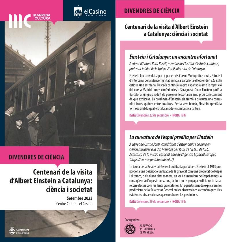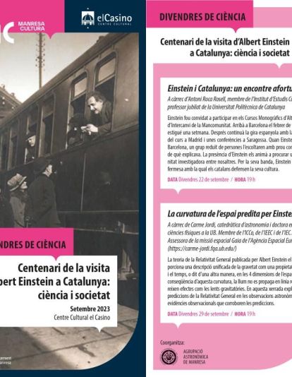 El cicle Divendres de Ciència de l'Ajuntament de Manresa ha programat per aquest mes de setembre dues xerrades que estan dedicades al centenari de la visita a Catalunya del científic més conegut i important del segle XX, Albert Einstein. Les xerrades se celebraran els divendres 22 i 29 de setembre a les 19 h, al Centre Cultural el Casino.