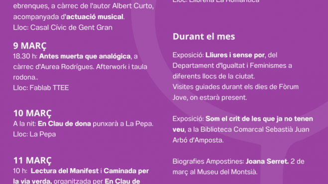 En Clau de Dona organitzarà les activitats del divendres 10 i dissabte 11. En concret, divendres 10 a la nit punxarà música a la Pepa i dissabte 11, farà lectura del manifest i caminada per la Via Verda. El punt de trobada serà al pàrquing de la Via Verda. El diumenge 12 de març, l’obra de teatre Iaia. Memòria històrica, a càrrec de l’Embarral produccions, posarà el punt de vista feminista.