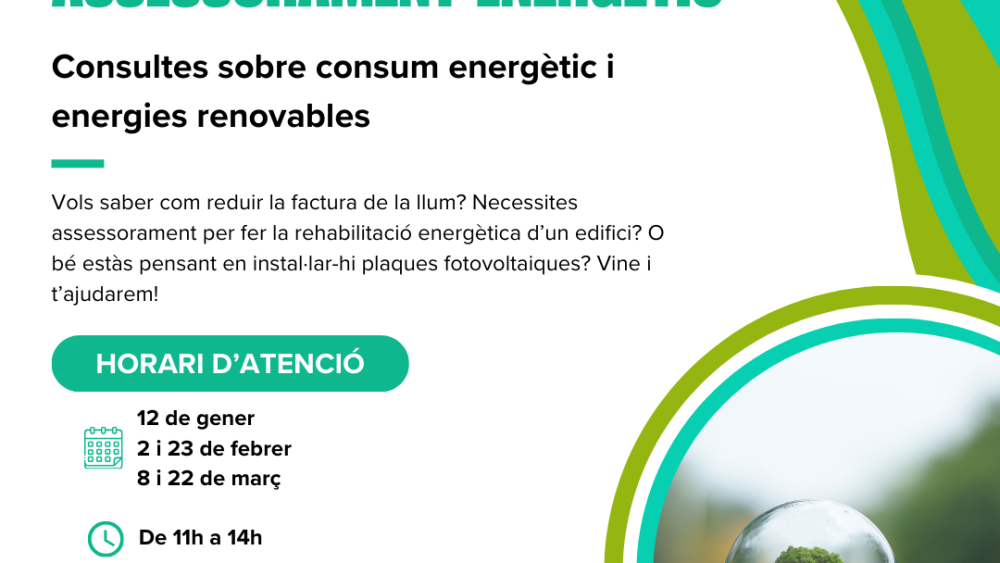 L’Oficina Comarcal de Transició Energètica, del Consell Comarcal del Montsià en col·laboració amb el Copate, obrirà un punt d’atenció a la ciutadania a l’Ajuntament d’Amposta durant el primer semestre de l’any. En concret, estarà d’11 h a 14 h. Els divendres 12 de gener, 2 i 23 de febrer, 8 i 22 de març, 5 i 26 d’abril, 10 i 24 de maig i 7 i 21 de juny.