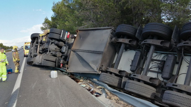 El conductor d'un camió ha resultat ferit en bolcar el seu camió a l'AP-7, a l'altura de l'Ametlla de Mar i en direcció Barcelona.