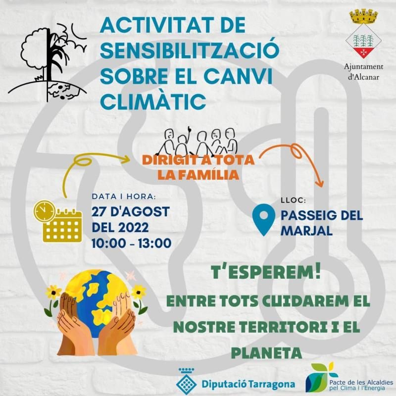 El canvi climàtic és una amenaça per al benestar de les persones, el patrimoni construït, l’activitat econòmica, els sistemes urbans i els sistemes naturals. Per això, l’Ajuntament d’Alcanar, a través de la regidoria de Medi Ambient i la Diputació de Tarragona i mitjançant el Pacte de de les Alcaldies pel Clima i l’Energia, ha desenvolupat un programa d’activitats de sensibilització i acció contra l’escalfament de la terra que tindrà lloc aquest dissabte, 27 d’agost, al passeig del Marjal, des de les 10 fins a les 13:30 h.