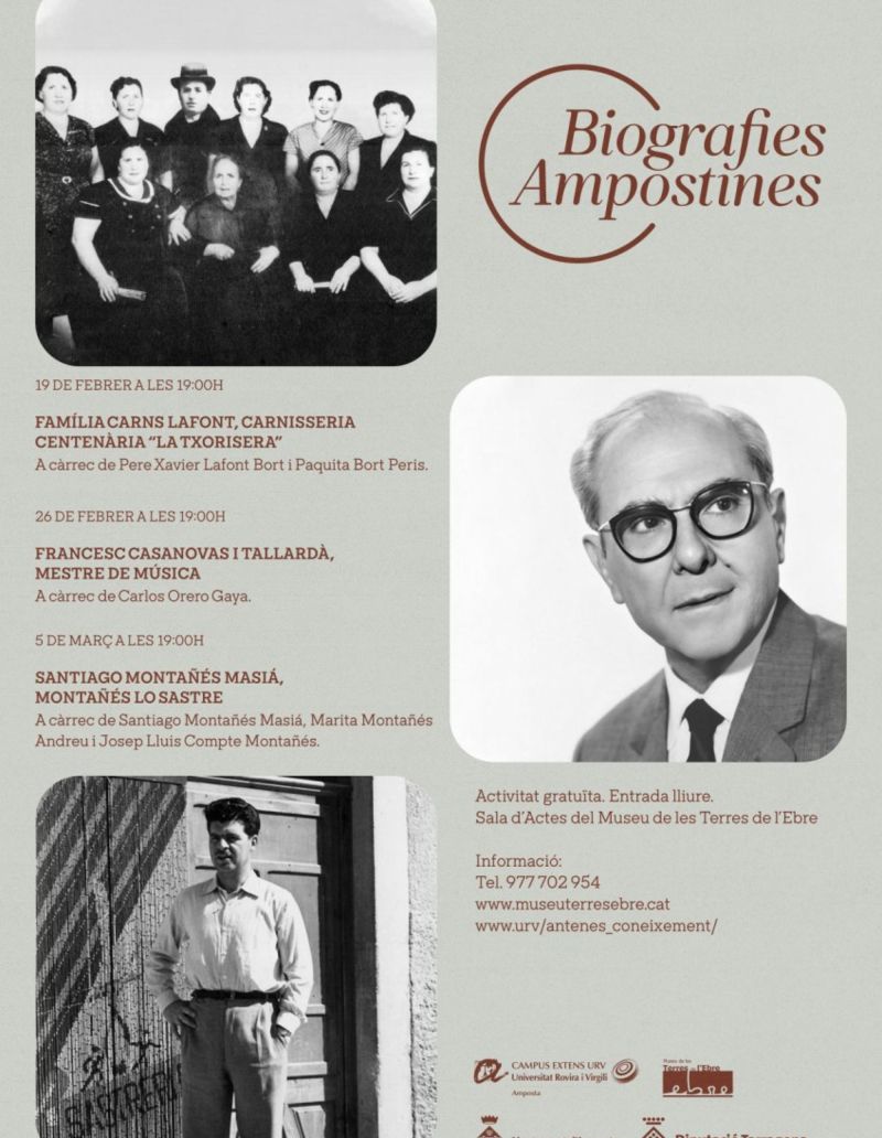 La 15a edició del cicle de conferències "Biografies Ampostines" té per objectiu recuperar i divulgar les vivències i els treballs fets per persones vinculades amb la ciutat, i les organitza el Campus Extens de la URV a Amposta, el Museu de les Terres de l’Ebre i Ajuntament d’Amposta, amb la col·laboració de la Diputació de Tarragona.