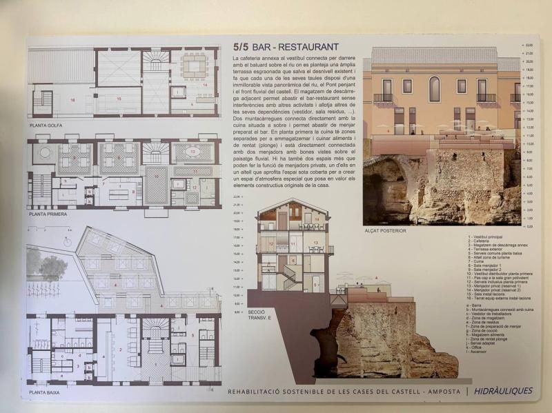 La proposta guanyadora, tal com explicava un dels seus autors, Carles Brull, pretén compaginar la preservació i valorada de les tres cases amb les restes medievals que se sap que hi ha a sota de la més oriental. Així, és proposta que en aquesta casa, on s’ubicarà l’oficina de turisme, quedaran visibles les restes en un espai diàfan museïtzat i amb accés a la celòquia i els espais exteriors adjacents. Quant a la casa central, el seu vestíbul, que mantindrà l’ambient de les construccions originals, serà el punt de connexió entre àmbits, i donant accés directe a la cafeteria i als serveis destinats l’activitat cicloturística, situats a la casa més propera a la Biblioteca. És en aquesta casa on hi haurà la cafeteria i restaurant, amb una terrassa sobre el riu. La rehabilitació preveu, a més, criteris de restauració de tots aquells elements que sigui possible mantenir.