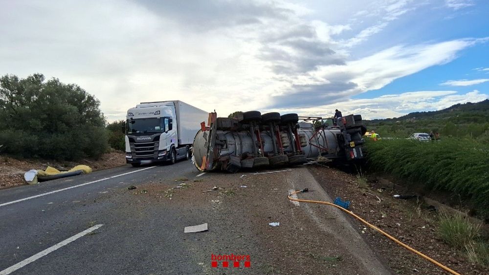 El vehicle transportava oli mineral i ha sofert una petita fuita, que ha estat segellada i recollida completament pels equips d’emergència dins d’una cubeta de contenció.