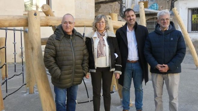 Així doncs, les millores de la plaça han consistit en la instal·lació d’una nova àrea de jocs infantils, al lateral del Palau d’Abària, que consta d’un conjunt de gronxadors de cordes per trepar, una molleta i un gronxador. Els seus acabats són tots de fusta gruixuda i resistent. Bel explica que “al final vam decidir escollir aquest model perquè era el que quedava més integrat en el paisatge, d’acord amb la petició de Patrimoni, que ens demanava que s’usessin materials poc invasius amb l’entorn patrimonial de la plaça”.