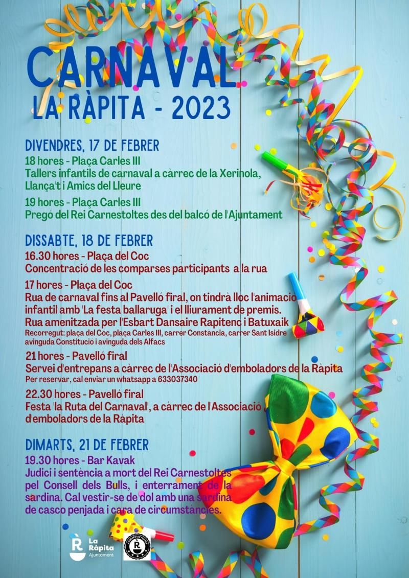 La programació s’engega el divendres, 17 de febrer, a les 18 hores, amb els tallers infantils de carnaval a la plaça Carles III, a càrrec de la Xerinola, Llança’t i Amics del Lleure. Tot seguit, a les 19 hores, hi haurà el pregó del Rei Carnestoltes des del balcó de l’Ajuntament. L’endemà, a les 16.30 hores, les comparses participants en la rua es concentraran a la plaça del Coc, i, a les 17 hores, començarà la rua, la qual estarà amenitzada per l’Esbart Dansaire Rapitenc i Batuxaik. Les comparses que vulguin participar han de presentar-se a l’Ajuntament o contactar amb el telèfon 674 08 16 94 abans del dijous 16 de febrer.