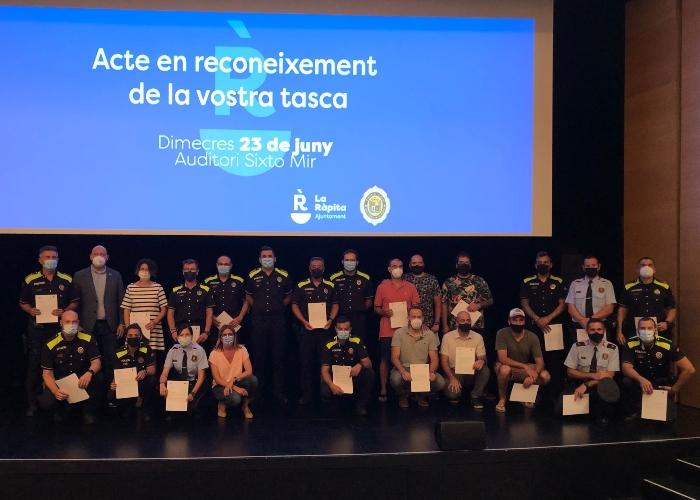 L’Ajuntament de La Ràpita ha celebrat un acte de reconeixement a la tasca d’onze membres de la Policia Local, cinc del Cos de Mossos d’Esquadra i deu ciutadans del municipi per la seva implicació cívica, demostrada en situacions de perill per a terceres persones, a les quals es van haver d’afrontar durant els anys 2020 i 2021. L’acte, impulsat per la Regidoria de Governació, s’ha dut a terme avui, dimecres 23 de juny, a l’Auditori Sixto Mir.