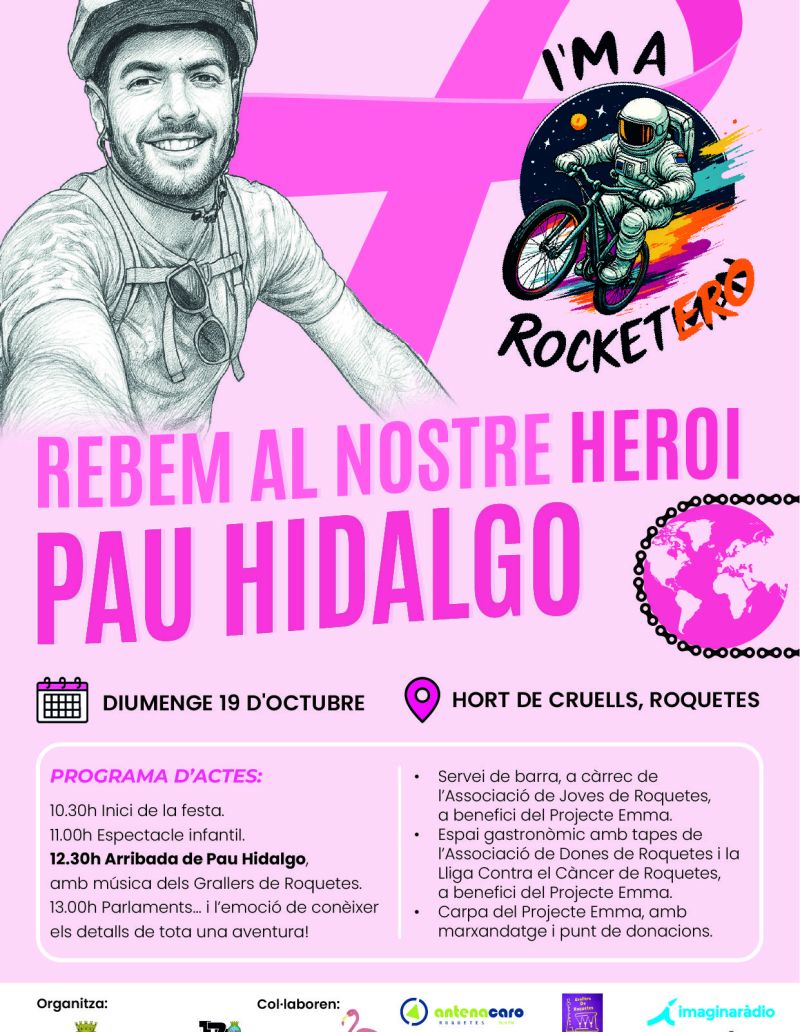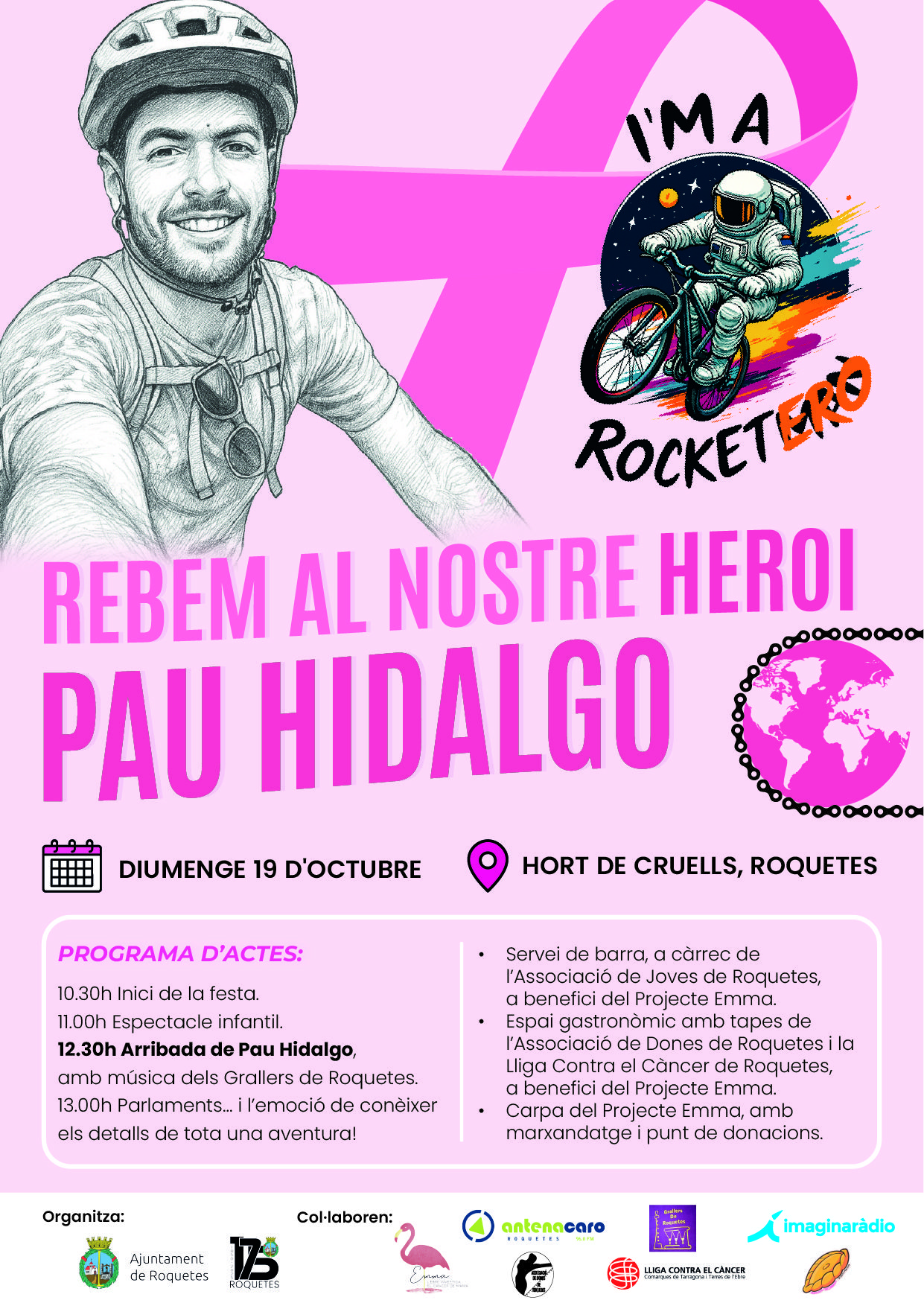 Data solidària marcada a l’agenda. Roquetes rebrà amb honors Pau Hidalgo, amb una gran festa de benvinguda el pròxim diumenge 19 d’octubre al matí, a l’Hort de Cruells. Coincidint amb el Dia Mundial de la Lluita Contra el Càncer de Mama, l’esportista local farà arribada al municipi després de donar la volta al món en bici, a favor del projecte Emma, per a la recerca i investigació d’aquesta malaltia, i per la qual ja ha recollit fins al moment 22.000 euros.