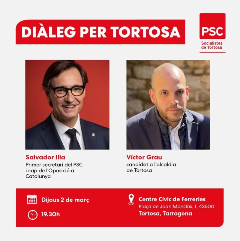 L’Assemblea local del PSC va escollir Víctor Grau per a encapçalar la llista socialista el passat mes de gener i la conversa amb Illa servirà per a donar-lo a conèixer a la ciutadania i per a parlar de la línia de treball del PSC per a la ciutat de Tortosa i els seus pobles. Grau i Illa conversaran de la Tortosa del futur en el marc d'una Catalunya socialista.