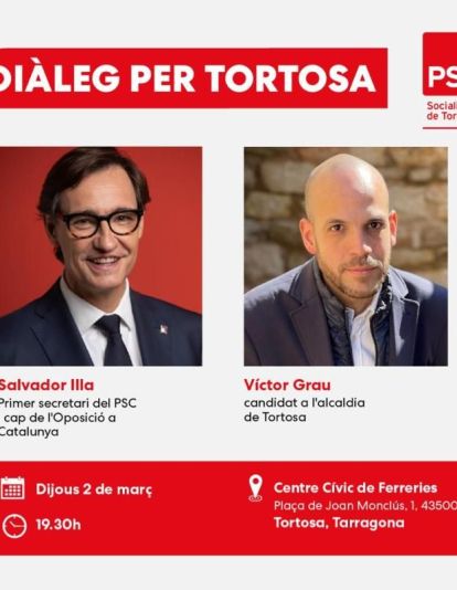 La conversa entre Illa i Grau tindrà lloc el pròxim dijous 2 de març a les 19.30 hores al Centre Cívic del barri de Ferreries a Tortosa. És un acte obert a tota la ciutadania.