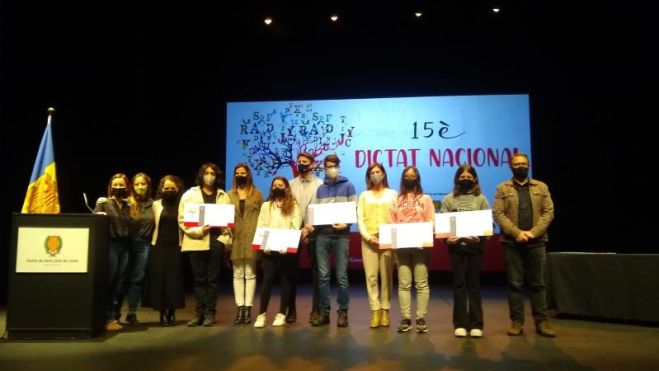 La ministra de Cultura i Esports, Sílvia Riva; la consellera de Cultura i Esports del Comú de Sant Julià de Lòria, Sònia Carrillo, i el director de Ràdio i Televisió d’Andorra, Xavier Mujal, han lliurat, aquest dissabte al Centre Cultural i de Congressos Lauredià, els premis del 15è Dictat nacional organitzat pel Servei de Política Lingüística.