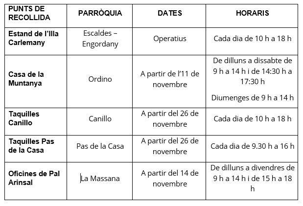 A aquests dos punts de recollida s’hi sumaran, a partir del dilluns 14 de novembre, les oficines de Pal Arinsal de la Massana, que estaran obertes de dilluns a divendres.