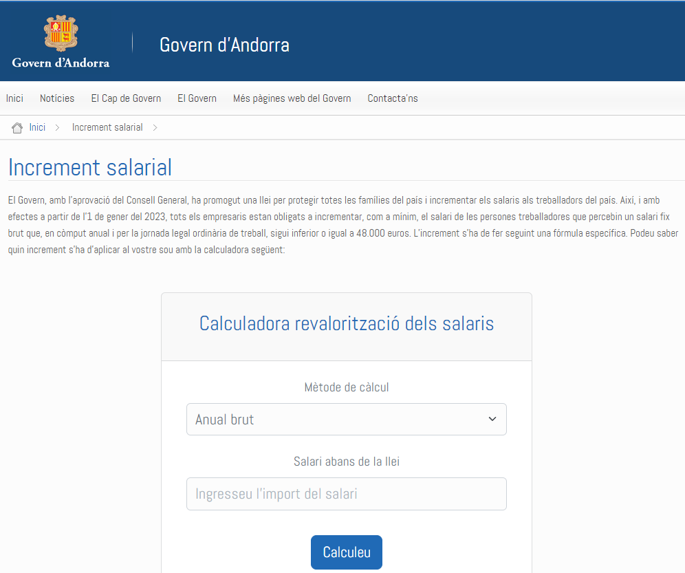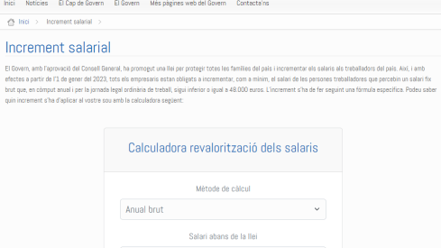 El Govern informa que, després de l’aprovació ahir per part del Consell General de la Llei de mesures urgents per a la millora del poder adquisitiu de la ciutadania i en matèria d’arrendaments d’habitatge, ha publicat una aplicació web perquè la ciutadania i els empresaris puguin conèixer amb facilitat l’increment que cal aplicar als salaris del sector privat per aquest 2023.