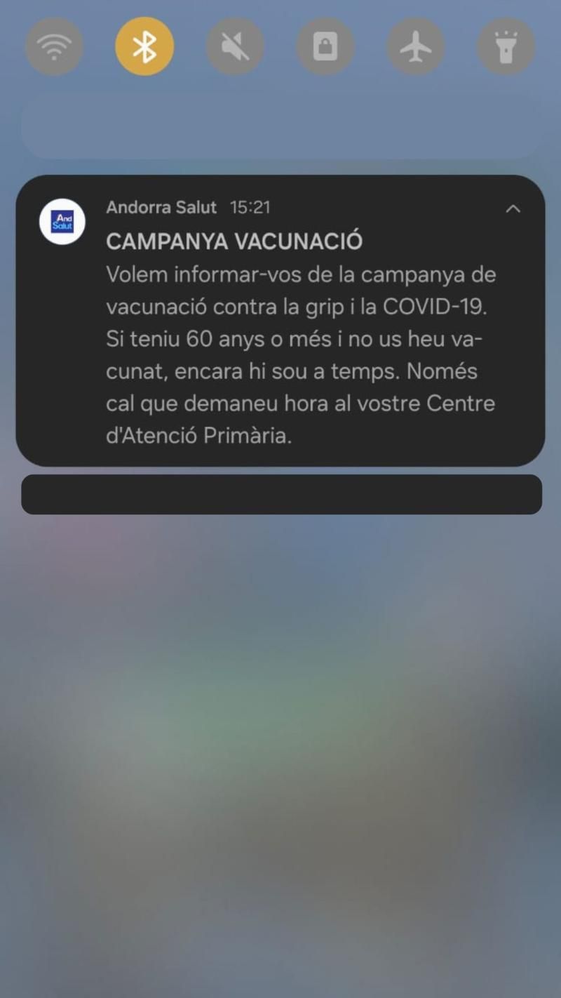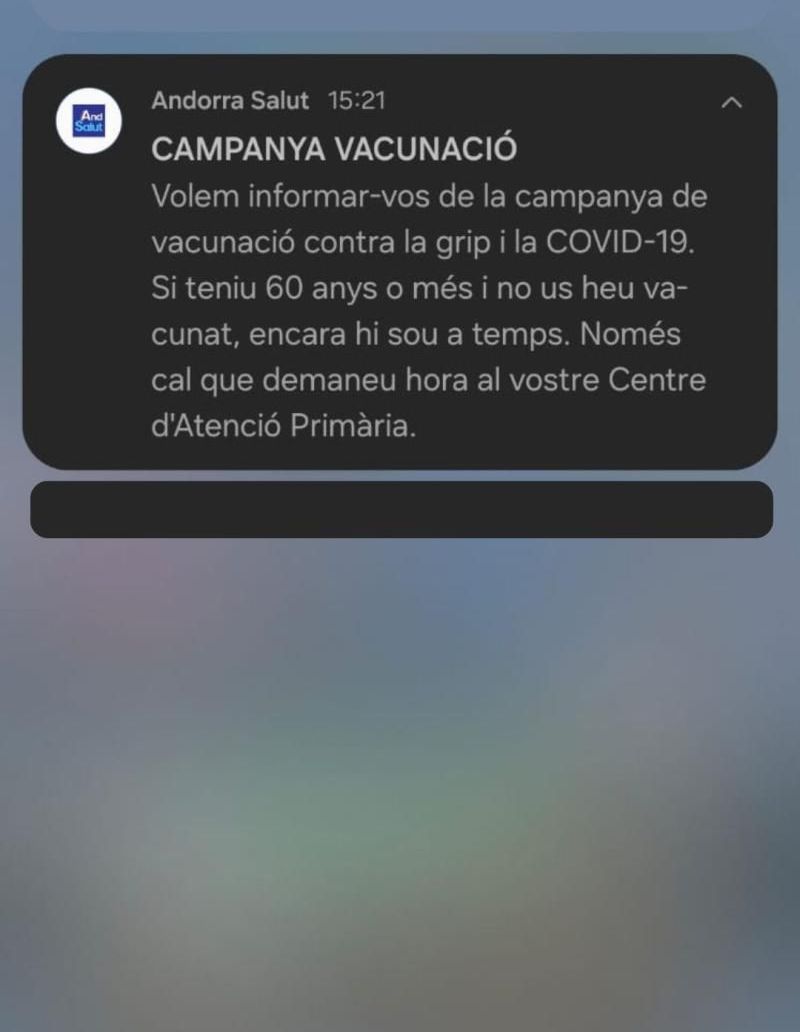 L’aplicació per a dispositius mòbils Andorra Salut incorpora una nova funcionalitat que permet que la població pugui rebre notificacions amb informació sanitària i d’interès públic. Amb aquesta actualització, els usuaris que tinguin l’aplicació instal·lada rebran missatges d’estil ‘push up’, que desapareixeran un cop llegits, amb informació com per exemple l’inici de les campanyes de vacunació contra la grip o la COVID-19.