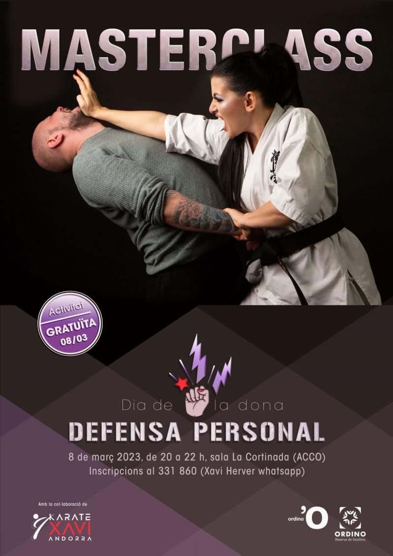 El Club de karate Xavi Herver organitza la segona màster de defensa personal a Ordino, després de l’èxit de l’edició passada, exclusiva per a dones i gratuïta. L’activitat es farà el dimecres 8 de març, de les 20 a les 22 h a la sala la Cortinada de l’ACCO (Andorra Congrés Centre Ordino). Cal fer prèvia inscripció per whatsapp al número 331 860.