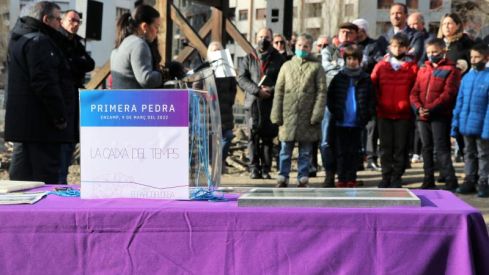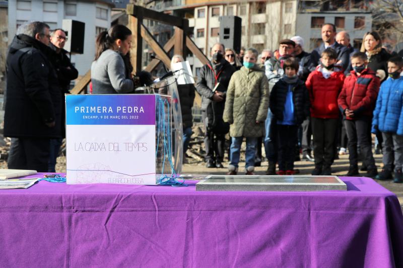 Laura Mas ha estat l'encarregada, juntament amb els diferents representants de la societat encampadana assistents a l'acte d'anar introduint els objectes que s'han inclòs dins de la caixa del temps: els diaris dels mitjans de comunicació en paper del dia en qüestió, una fotografia aèria del dia, una revista de carnaval del 2022, una moneda d'un euro, dos segells i mata-segells del dia de Correos i de La Poste, la Consueta d'Encamp on es recullen les festes i celebracions de la parròquia i el discurs de la cònsol major, elements que en un hipotètic cas d'obertura en un futur situarien el moment de la primera pedra en un espai físic i temporal, una manera simbòlica de recordar el moment exacte de la primera pedra.