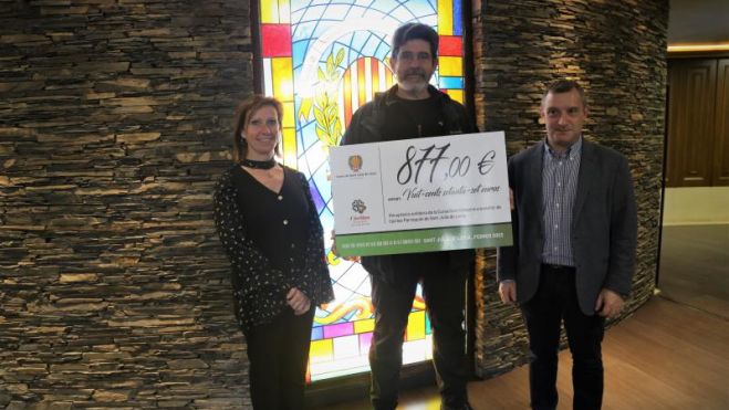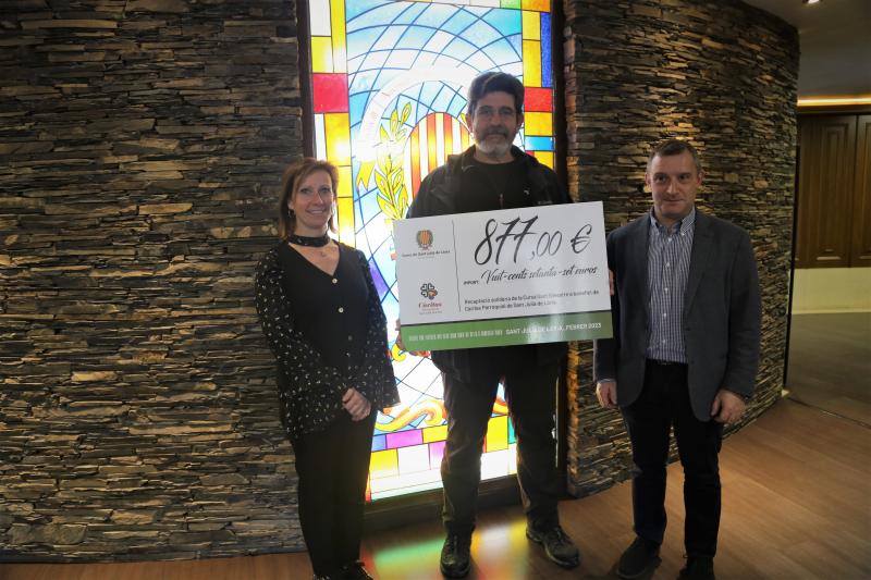 Els cònsols Josep Majoral i Mireia Codina de Sant Julià de Lòria han entregat un xec valorat en 877 € al president de Càritas Parroquial, Jordi Gonzàlez.