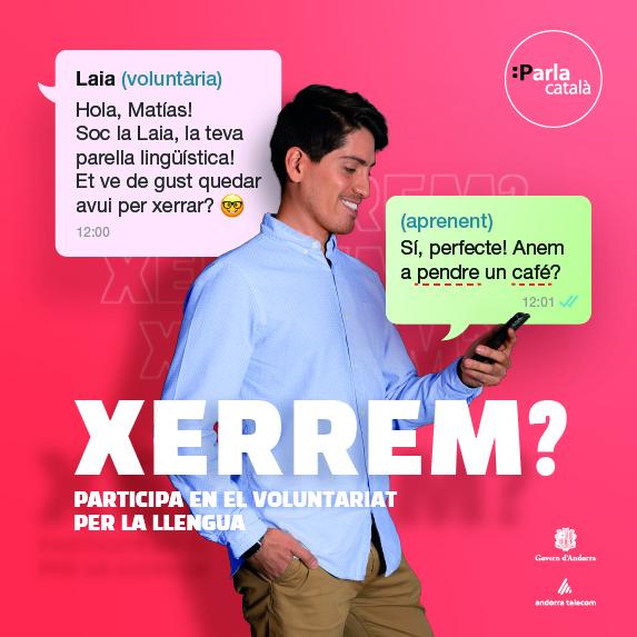 El Departament de Política Lingüística i Andorra Telecom reactiven la campanya de promoció i informació del programa de Voluntariat per la llengua. La promoció es renova de manera periòdica cada dos anys amb la voluntat d’atreure nous participants. El lema que es va triar per a l’última campanya, ‘Xerrem?’, i el vídeo de promoció tornaran a ser presents a les xarxes socials, les webs i els canals habituals de Política Lingüística i al local d’atenció al públic d’Andorra Telecom, per donar un nou impuls al programa de creació i dinamització de parelles lingüístiques.