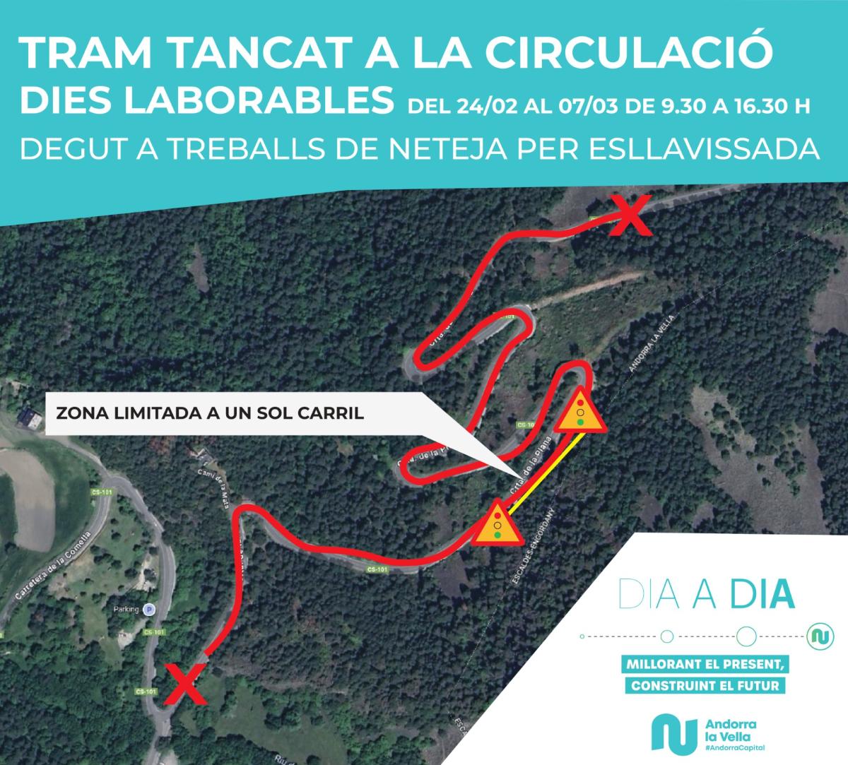 La carretera de la Comella, que connecta Andorra la Vella amb Escaldes-Engordany, s’ha reobert parcialment aquest divendres amb pas alternatiu regulat per semàfors. Els talls per garantir l’estabilització del talús es reprendran dilluns vinent entre dos quarts de deu del matí i dos quarts de cinc de la tarda, hora a partir de la qual es tornarà a permetre la circulació en sentit altern.