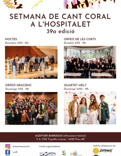 L’Auditori Barradas de l'Hospitalet acollirà la 39a edició de la Setmana de Cant Coral els dies 5, 6, 7 i 14 de maig. Aquest cicle l’organitzen les corals de la ciutat: Heura, Xalesta i Elisard Sala, per fomentar i promocionar aquesta disciplina musical. Quatre formacions, unes de llarg recorregut i altres més joves, oferiran les seves propostes que van més enllà de la música. L’entrada serà mitjançant taquilla inversa.