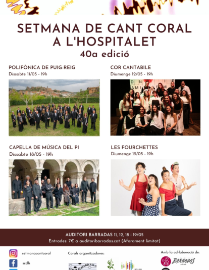 L’Auditori Barradas acollirà la 40a edició de la Setmana de Cant Coral de l'Hospitalet de Llobregat durant dos caps de setmana consecutius, els dies 11, 12, 18 i 19 de maig, en una edició que comptarà amb quatre concerts d’estils diversos. Aquest cicle l’organitzen les corals de la ciutat: Heura, Xalesta i Elisard Sala, per fomentar i promocionar aquesta disciplina musical.La Polifònica de Puig-reig, dirigida per Emmanuel Niubò, obrirà el cicle dissabte, 11 de maig. L’agrupació, fundada el 1968, desenvolupa una intensa activitat a Catalunya i arreu del món. El seu repertori inclou oratoris barrocs, musicals, òpera i sardanes. L'any 1993 li van atorgar la Creu de Sant Jordi.L’endemà, diumenge, el Cor Cantabile, un cor femení creat el 1999 al Cercle de Gràcia, mostrarà el reu repertori, que inclou música pop i bandes sonores i musicals. El cor va participar a Oh Happy Day de TV3 i ha col·laborat amb artistes com Txarango, Joan Dausà, 9son o Lal'Ba.