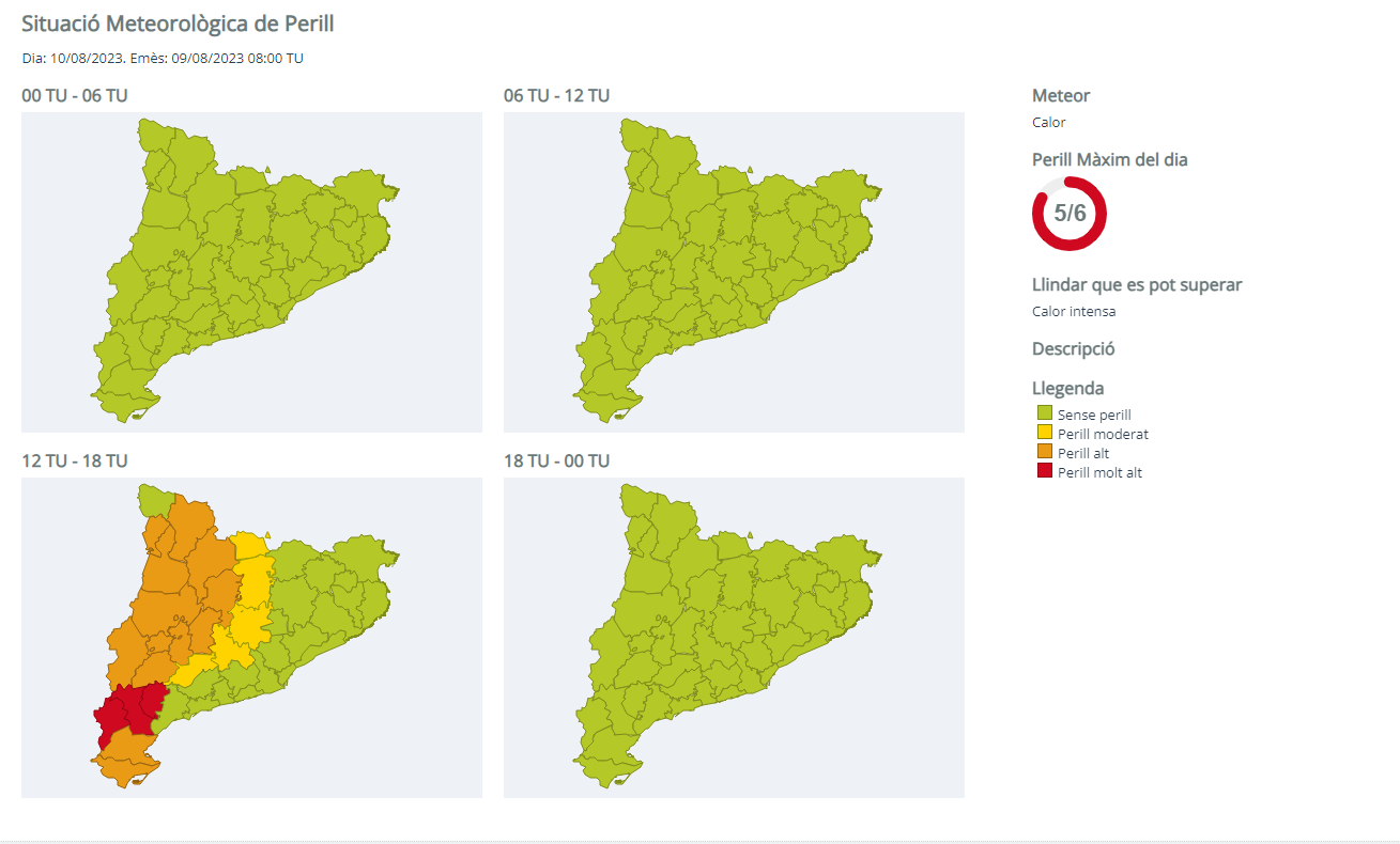 La calor tocarà sostre a l'oest de Catalunya i el perill es preveu molt alt a les comarques de la Terra Alta, la Ribera d'Ebre i el Priorat. En aquestes tres comarques, el Servei Meteorològic de Catalunya ha emès un avís de perill per calor molt intensa de 5 en una escala de 6 dijous a la tarda, amb temperatures que podrien arribar als 43 graus.