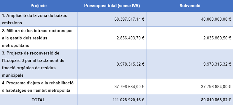 La inversió europea cobreix el 66 % del cost total dels projectes desenvolupats, que ascendeix a 194 milions d’euros. Amb aquesta inversió, l’AMB promou la millora dels serveis i les infraestructures de la metròpolis de Barcelona, i té com a objectius afavorir el pas cap a una economia baixa en carboni, transformar la mobilitat cap a un model més sostenible, digitalitzar el territori, protegir el medi ambient i millorar el patrimoni cultural i rehabilitar els habitatges obsolets que es troben a la metròpolis de Barcelona, entre d’altres.