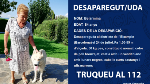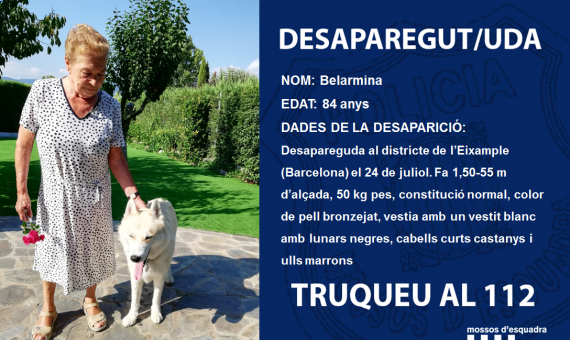 Els Mossos d'Esquadra busquen a Belarmina, una dona de 84 anys que ha desaparegut aquest divendres, 24 de juliol, al districte de l'Eixample de Barcelona.