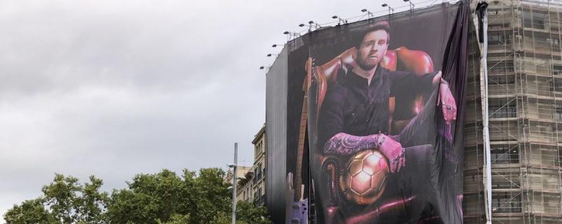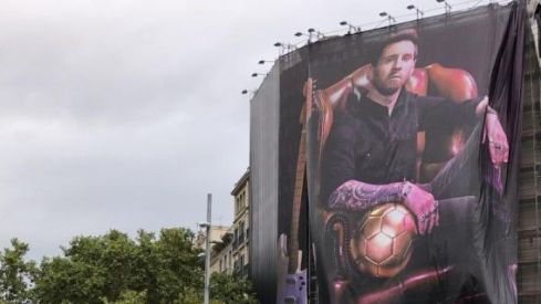 Leo Messi ha reaparegut a Barcelona aquest dilluns. Ho ha fet estampat en una lona gegant, i acompanyat d'una pilota d'or i una guitarra elèctrica al passeig de Gràcia.