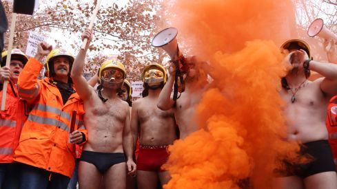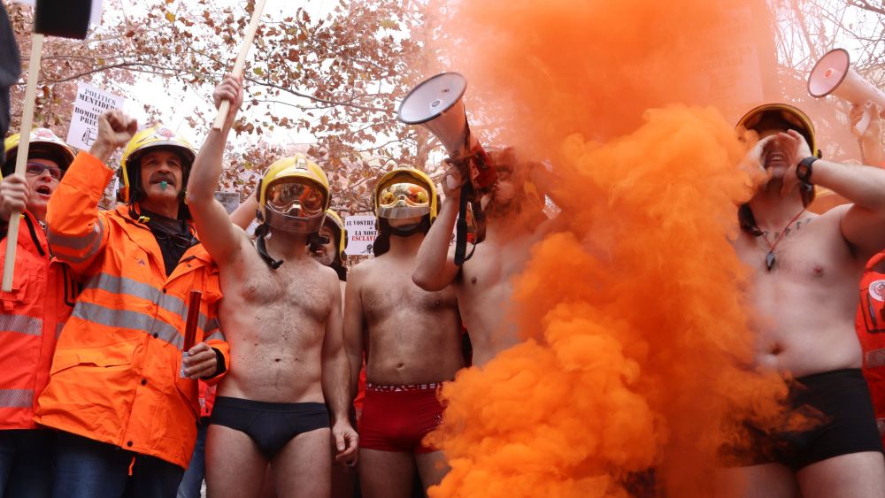 Un centenar de bombers voluntaris han protestat aquest divendres davant el Departament d’Interior per la “precarietat” amb què treballen. Per visibilitzar la “desprotecció” en una acció simbòlica, una desena d’ells s’han tret la roba i s’han quedat en calçotets aguantant la pancarta en què manifesten que “tots” els bombers són treballadors però que els voluntaris ho són “low-cost” i en “frau de llei”.