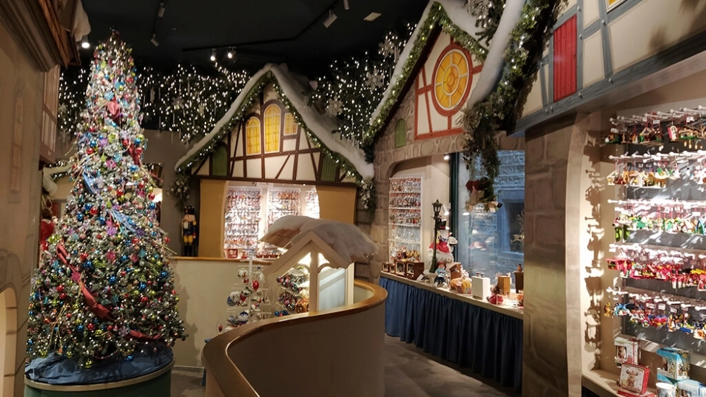 L’experiència comença abans d’entrar: la cua, llarga i pacient, ja anticipa que el que hi ha a dins no és una botiga qualsevol. Un cop travessat el llindar, el visitant es troba amb un itinerari interior pensat perquè ningú passi de llarg. El recorregut serpenteja entre trams d’escala, avets il·luminats i prestatgeries que brillen plenes d’ornaments.