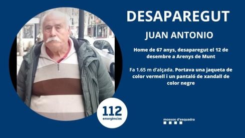 Els Mossos d'Esquadra han fet una crida per trobar Juan Antonio, un home de 67 anys que va desaparèixer el passat 12 de desembre a la localitat d'Arenys de Munt, a la comarca del Maresme.