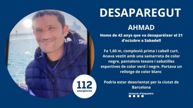 Els Mossos d'Esquadra fan una crida per trobar l'Ahmad, un home de 42 anys que va desaparèixer el 21 d'octubre a Sabadell.