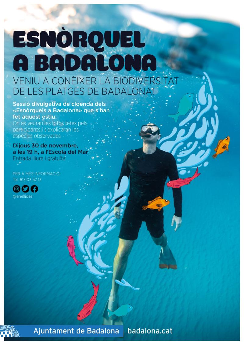 Cal recordar que la immersió lleugera o esnòrquel és la pràctica de nedar a la superfície de l'aigua amb una màscara subaquàtica i un tub i, generalment, amb aletes. “Esnòrquel a Badalona” és una activitat de coneixement i observació ambiental, promoguda per l’Ajuntament, dirigida a donar a conèixer la biodiversitat del fons marí que es va desenvolupar durant deu sessions els caps de setmana entre els mesos de juliol i setembre a diferents platges de Badalona. Hi van participar un total de 198 persones, la majoria famílies badalonines.