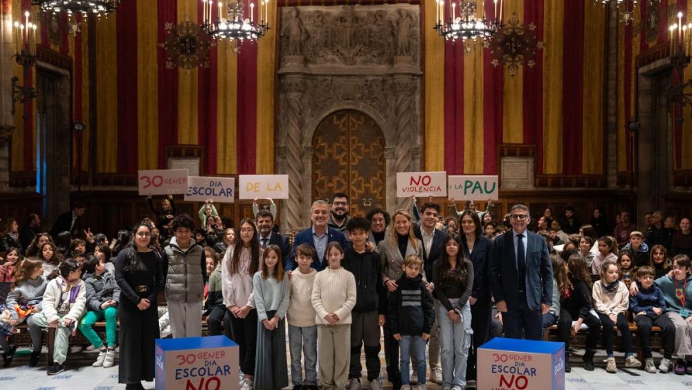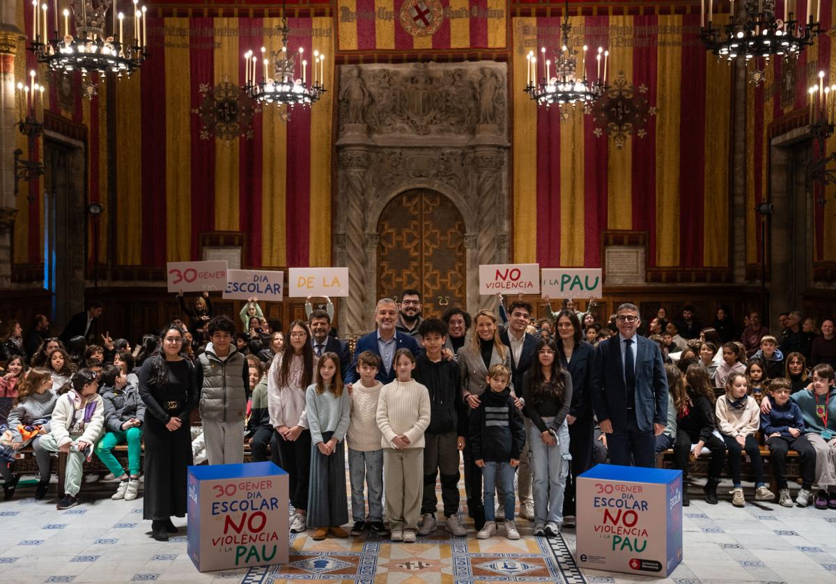 Amb motiu de la commemoració del Dia escolar de la no violència i la pau, que se celebra el 30 de gener, alumnes de 5è, 6è de primària, i 1r d’ESO de l’Institut Escola Elisenda de Montcada, l’Escola El Polvorí, l’Escola Concepció, i l’Escola Dolors Monserdà-Santapau han participat avui en un acte al Saló de Cent de l’Ajuntament, que ha presidit l’alcalde, Jaume Collboni, acompanyat de la tinenta d’Alcaldia de Drets Socials, Educació i Cicles de Vida, Maria Eugènia Gay; del tinent d’Alcaldia Prevenció, Seguretat, Convivència i Règim Interior, Albert Batlle, i del comissionat de Polítiques d’Infància, Adolescència, Joventut i LGTBI, Javier Rodríguez.