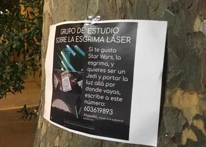 Les persones atentes del barri de Gràcia hauran pogut veure aquests dies alguns cartells curiosos penjats arreu. En ells s'hi anuncia ni més ni menys que un grup d'estudi sobre l'esgrima làser. "Si t'agrada Star Wars, l'esgrima, i vols ser un Jedi i portar la llum allà on vagis...", resa el cartell que inclou un número de contacte i una persona de contacte, l'Alejandro.