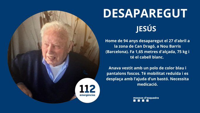 Es tracta d'en Jesús un home de 94 anys que viu a Can Dragó, al districte barceloní de Nou Barris, segons han comunicat els Mossos d'Esquadra a través de les seves xarxes socials.