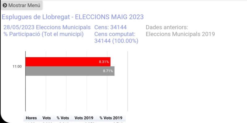 11:21 h - Primeres dades de participació. A Esplugues de Llobregat, a les 11 h, la participació és del 8,31 %, lleugerament per sota del 8,71 % del 2019.