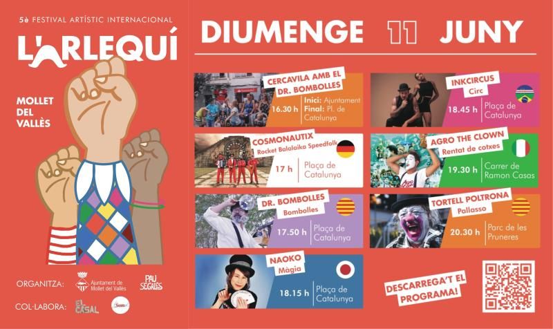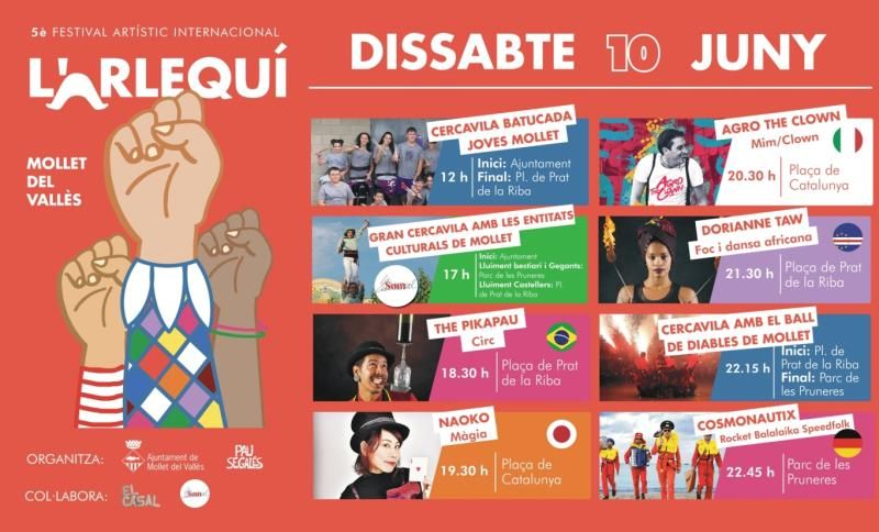 Aquest proper cap de setmana, 10 i 11 de juny, el Festival Internacional l’Arlequí tornarà a omplir els carrers de Mollet del Vallès en una 5a edició en la qual participaran artistes de primer nivell provinents de 6 països d’arreu del món. L’esdeveniment és una clara aposta de la ciutat per potenciar les arts escèniques de carrer.