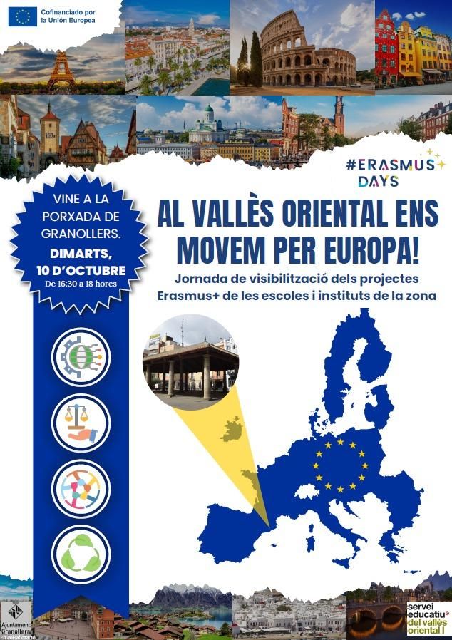 Granollers se suma a la celebració dels #ErasmusDays amb dues propostes el dimarts 10 d’octubre. De 16.30 a 18 h a la plaça de la Porxada, el Servei Educatiu del Vallès Oriental I i els centres participants, en col·laboració amb l’Ajuntament de Granollers, organitzen la jornada «Al Vallès Oriental ens movem per Europa». La proposta servirà per visibilitzar els projectes Erasmus+ de les escoles i instituts de la zona. De Granollers hi participaran les escoles Ferrer i Guàrdia, Salvador Llobet, Pereanton i Mestres Montaña, i els instituts Celestí Bellera, Cumella, Escola Municipal del Treball i Carles Vallbona.