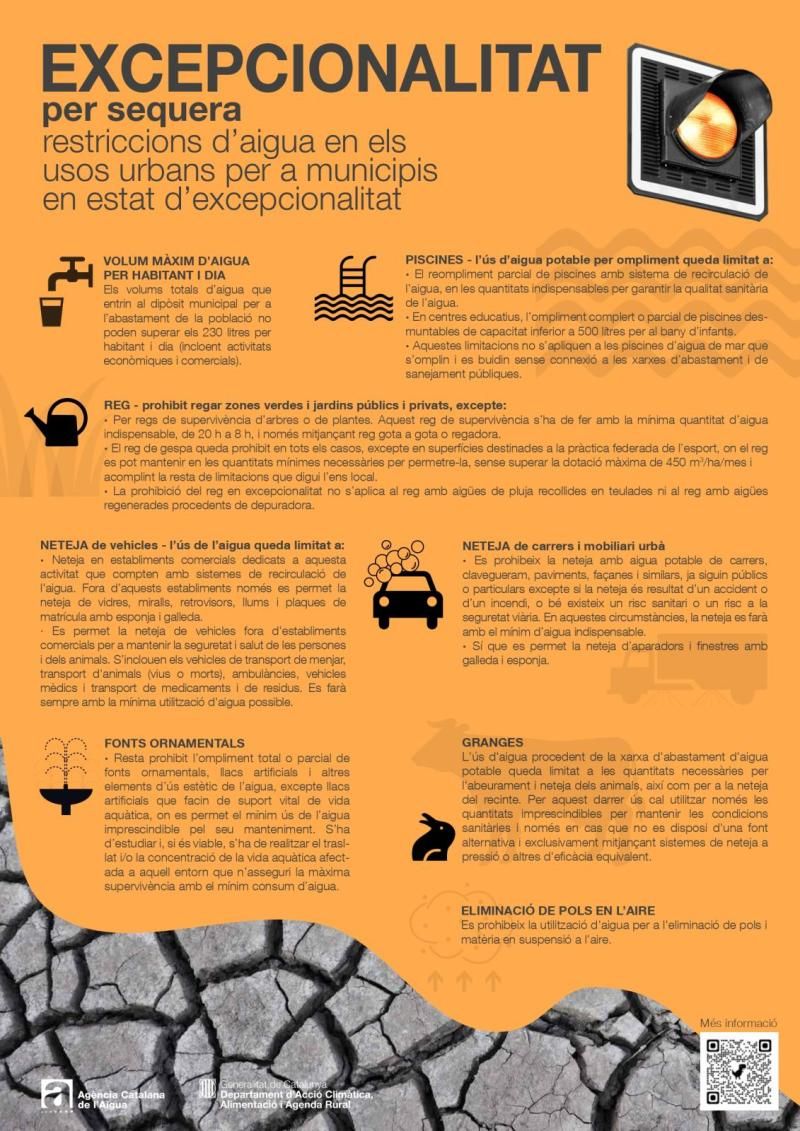 - S'estableix un volum màxim d'aigua per habitant i dia. Els volums totals d’aigua que entrin al dipòsit municipal per a l’abastament de la població no poden superar els 230 litres per habitant i dia (incloent activitats econòmiques i comercials).