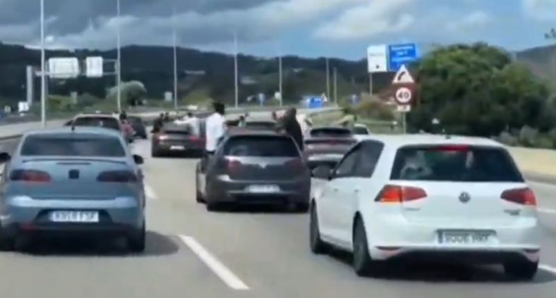 A les imatges, es veuen mitja dotzena de vehicles, entre els quals algun d'alta gamma, amb part dels ocupants amb mig cos fora mentre es van cridant els uns als altres.