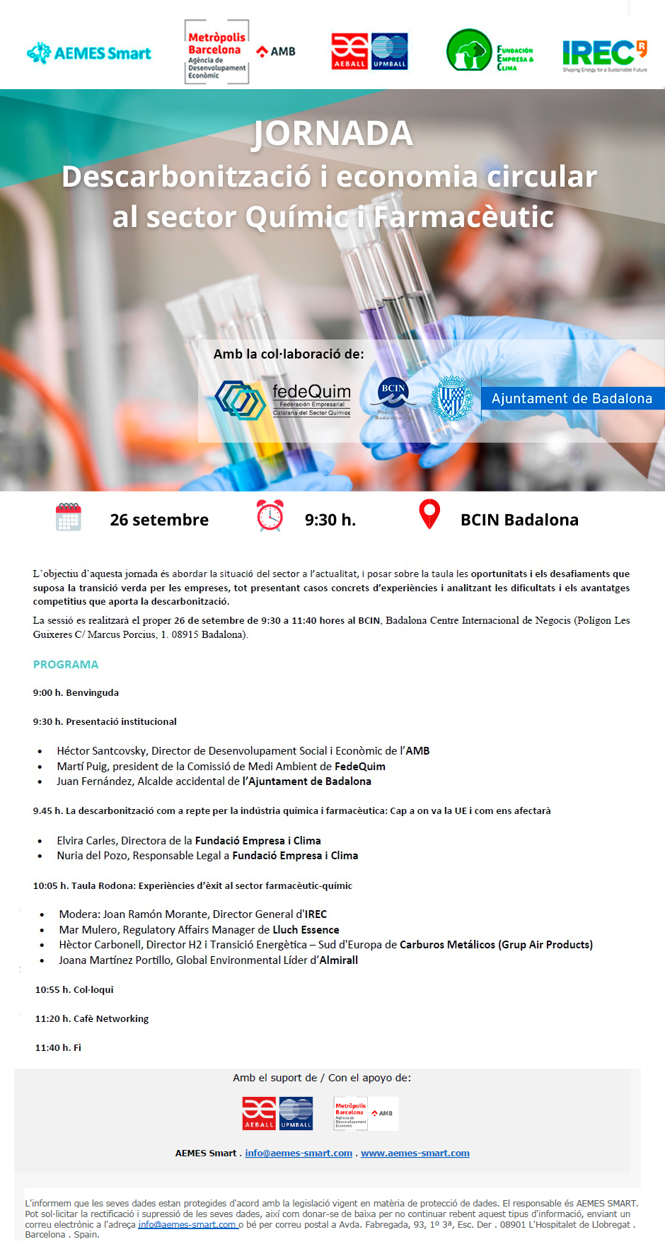 Aquesta jornada forma part d’un cicle de jornades dedicades a la descarbonització industrial que s’estan celebrant en diferents municipis de l’Àrea Metropolitana de Barcelona, i que estan organitzades per AEMES Smart (Asociación de Empresas de Movilidad, Entorno Sostenible i Smart), l’Àrea Metropolitana de Barcelona (AMB), l’IREC (Institut de recerca de l’Energia de Catalunya), i la Fundació Empresa i Clima. La jornada compta amb el suport d’AEBALL / UPMBALL (Associació Empresarial i Unió Patronal Metal·lúrgica de l’Hospitalet i el Baix Llobregat), FEDEQUIM (Federació Empresarial Catalana del sector químic) i de l’Ajuntament de Badalona a través de Reactivació Badalona.