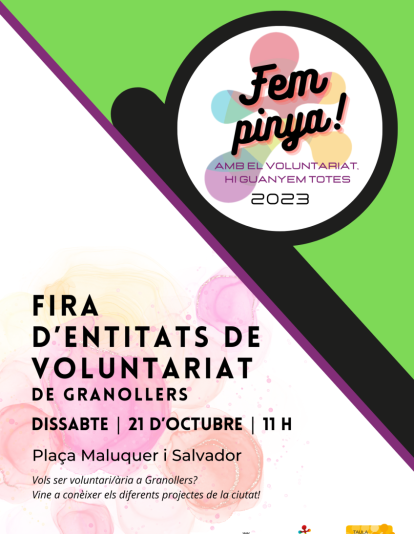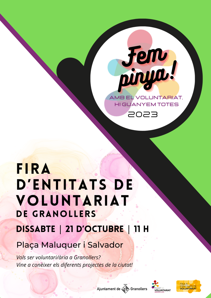 Dissabte 21 d’octubre, a les 11 h, a la plaça Maluquer i Salvador, se celebra una nova edició de la Fira d’Entitats de Voluntariat de Granollers, organitzada per la Taula d’Entitats del Punt de Voluntariat de l’Ajuntament de Granollers. L’objectiu de la jornada és donar a conèixer les diferents entitats de voluntariat de la ciutat i els diversos projectes que duen a terme.